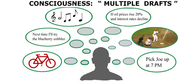 • According to Dennett, a "draft" is elevated to prominence by immediate environmental needs, as perceived; if you are driving and listening to music, you may be concentrating on the music and alternately thinking about your child's recent soccer game and an upcoming project at work, until a car runs a stop sign right in front of you. At that point, your "consciousness probe" shifts away from the thinking and hearing streams and towards the visual stream, and also towards your muscles as you hit the brake and jam the wheel to avoid a crash.