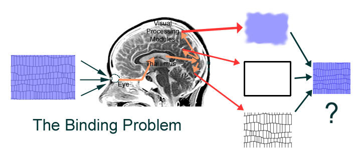 • Based on these experiments, brain researchers have a lot of good information now which has given a wealth of insights on how the mind works (e.g., the problem of "binding"; when you look at a blue box, for example, one area of the mind processes blueness; another area processes the boxy outline; another processes the texture of the box's surfaces; so how and where are all three "process states" brought together into a unified image of the box? This problem also applies to coordinating the sensory inputs of sound, smell and touch).