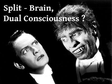 • Split brain conditions, when the corpus callosum and other connective tissue between the left and right brain halves are severed. These conditions are sometimes caused by injury, but were also surgically imposed during the 1960s as a means to control serious epilepsy seizures. Although such patients do not exhibit dramatic multi-personality behavioral swings, tests show that mind and body awarenesses are more bifurcated in split brain patients; e.g. a word or image seen in the right eye only can cause a reaction with the left hand; no reaction would be had via the right hand (recall the left-right swap between eyes and brain-side).