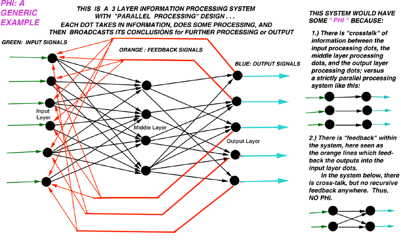 • Tononi derived a statistical measure of information enhancement, called "phi", meant to gauge the degree of information added by the brain's processing structure to the information contained within the sensory inputs; i.e. the information added because of the recursional processing that the system does with the input and output information. (If no output recursion, i.e. feedback, then there is no PHI in the system). The Phi measure is also influenced by the amount of integrative cross-talk in sharing and processing information as it flows through the system; but integration with the recycled outputs from the last round of system processing is a "sine qua non" of Integrated Information Theory (I.I.T.) and Phi. Again, "Phi" is a generic measure that applies to all information processing systems, not just the human brain. Phi increases relative to the degree of information generated AMONG the operating components (elements) of a system, as compared to information generated WITHIN them.