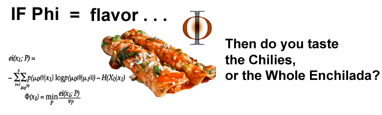 • A crude example / anology for this involves enchiladas. An enchilada, once baked, is a system of components (sauce, meat, cheese, tortillas, chilies, etc.) which chemically and molecularly overlap because of the heating process. When you eat an enchilada, does its "Phi" (in the sense of flavor) come from the whole enchilada, or from some part within it? If all of the parts work together such that when you bite in, you don't notice any one of them, i.e. you only experience "the whole enchilada", then it seems obvious that the "flavor Phi" of each component was less than the "flavor Phi" of the whole. By comparison, let's say that the sauce had way too much garlic or corriander, or the chilies were very hot and assertive; in that case, you would not experience "the whole enchilada", but instead would notice the overly-spicy sauce or the raging hot chilies. Your experience would be defined by the "flavor Phi" of the superior complex (the sauce or the chilies), because their Phi exceeds the Phi of the overall system (i.e., the baked enchilada). The enchilada thus no longer has an independent "flavor consciousness".