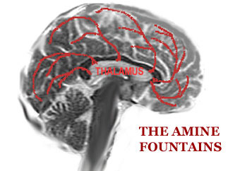 • The Thalamus (just above the brainstem) and the Reticular System (within the brainstem): These are the great regulators of our state of arousal, including sleep versus wakefulness (see "Degrees of Consciousness" above). The thalamus The Thalamus is well-connected, the great switchboard of the brain is also "well connected", having direct neuronal circuits to all regions of the brain, as well as the neurotransmitter system emanating from it. The later system (the amine fountains) is a series of spaghetti-like structures that permeate the brain, spraying various kinds of neurotransmitters (endorphins, serotonin, dopamine, acetylcholine, etc.) that variously bias our levels of arousal, emotional states, and our cognitive decision-making processes.