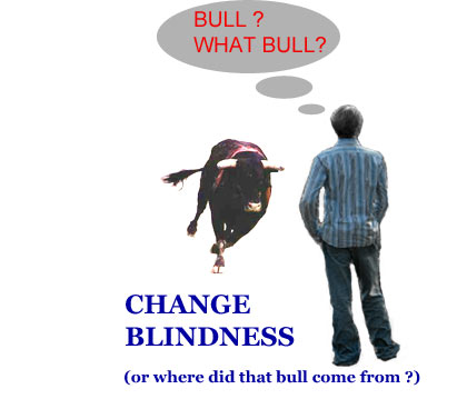 • Two related concepts that exemplify this are change blindness and inattentional blindness. Given that we shape our perceptions based on what we usually see, hear, feel and otherwise experience, we sometimes miss what should be an obvious (but unexpected) change. Or at best, it takes a few fractions of a second longer to perceive when something is very different from what we usually experience. Car accidents sometimes turn out worse than human reaction times would require, because an abnormal situation (like a car running a red light in front of you) takes a few parts of a second longer to comprehend -- your mind just doesn't believe it at first! Thus you don't step on the brake as quickly as you might have.