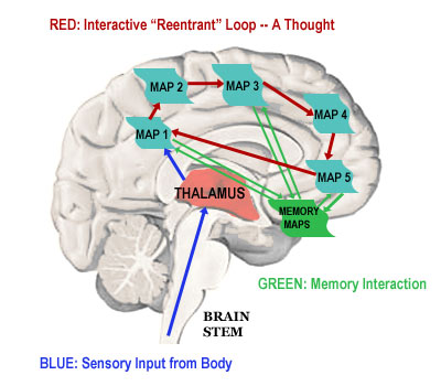 • A popular and well-regarded theory regarding the brain process underlying consciousness is the concept of "re-entrant mapping loops" from Gerald Edelman. The brain may be composed of neuron groupings / assemblies which work together for a particular purpose. These are the "maps"; maps may turn out to be a local neural network (see Section 30), or combination of such networks acting together as a meso-scale network mechanism, responsible for some specific aspect or component of perception, thought or memory. Each map is connected to many other maps; there are a lot of different routes for electrochemical signaling between maps. Each map may also have a "frequency" characteristic, regarding how frequently the neurons in the map fire and rest.