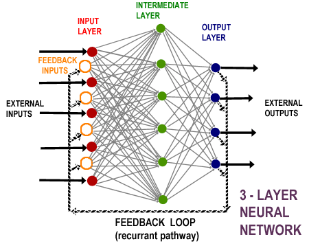 • These loops impose a “recursion momentum” which helps to perpetuate the state that they currently detect or experience. They help to keep consciousness from being too jumpy; they help to make it look like a continuous flow. The whole point of “recursion”, i.e. feeding-back the outputs into the input side of the analytical mechanism (see the neural network diagram in section 30), is to promote the overall stability of output. In effect, recursion / feed-back makes the continually updating system ask, how much should I change what I last outputted, considering what I'm now seeing from the new inputs? (As compared with just independently coming up with new outputs based solely on what was just inputted.)